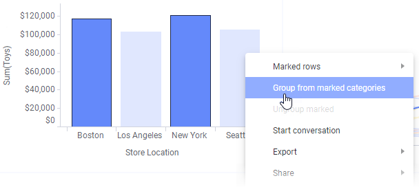 When creating visualizations, you usually split data into different category values using various axis selectors. You may for example split the data by selecting a category on the X-axis, Y-axis, or the Color axis. When you find it beneficial to group category values on an axis to get fewer categories, you indicate which categories via marking items in your visualization.