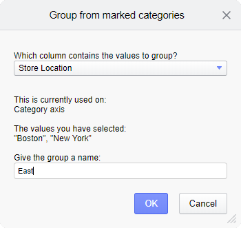 Select the column from which values should be grouped. In this case the only splitting made is the Store location column on the Category axis, and the values you have pointed out by marking are "Boston" and "New York". Also give the group a suitable name.