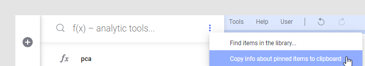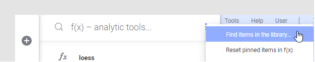 The f(x) flyout is used to provide easy access to commonly used data functions. As an analysis author with the Pin data functions and the f(x) flyout license feature, you can pin your own selection of data functions from the library to the flyout. You can also pin or unpin built-in data functions or tools (if you have access). An administrator can predefine selected data functions using a preference.