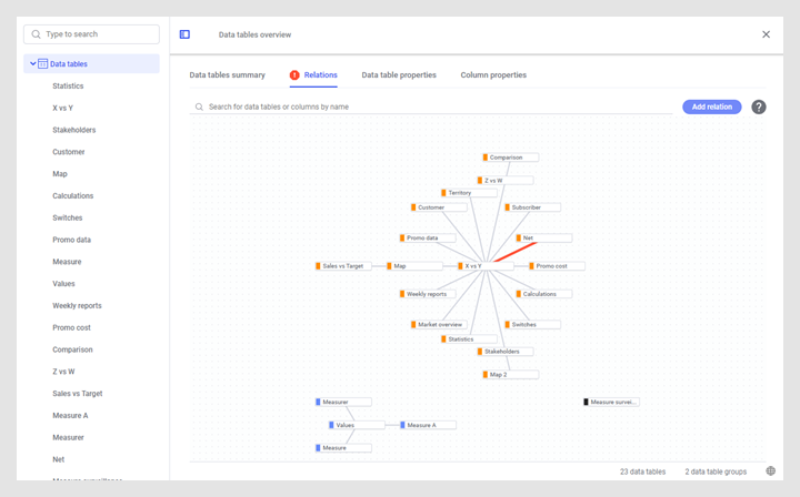 You can also add some simple relations using the Link data tables recommendation, which can show up if you select a suitable ID column for one of your data tables in the Data in analysis flyout.