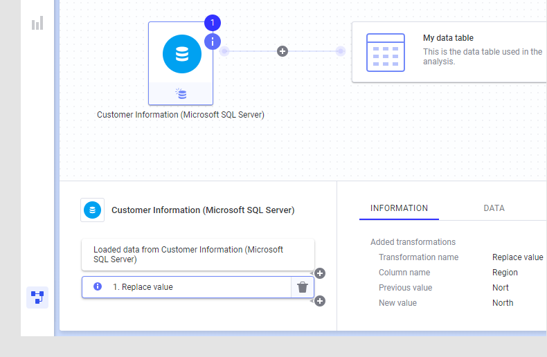 In this example, the creator of the analysis used the 'replace value'-transformation to fix a spelling error in the data table. However, at a later stage, someone updated the data in the linked source and the 'replace value'-operation was no longer needed: