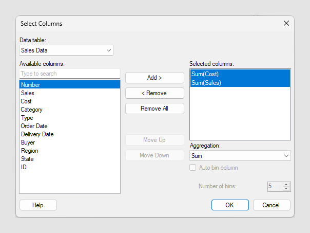 Select columns dialog, in the