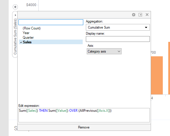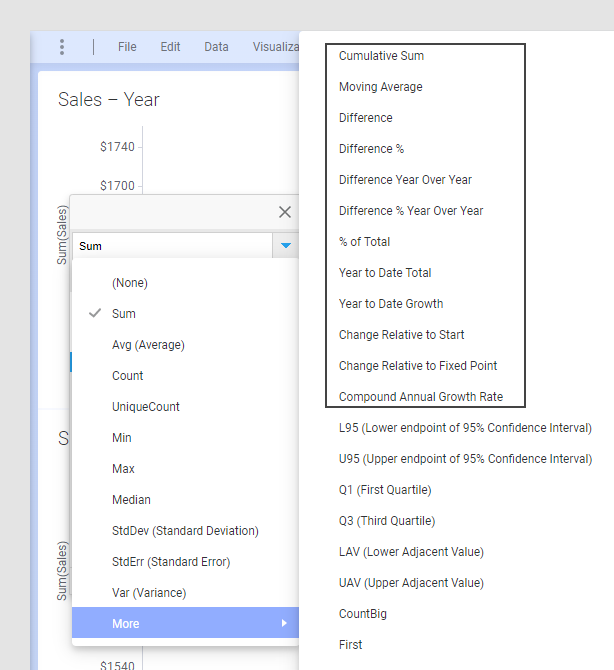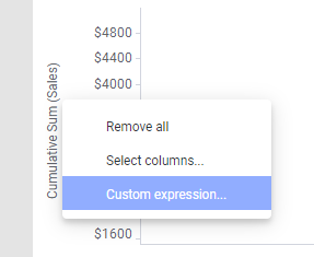 Some custom expressions are more commonly used than others, for example, moving average and cumulative sum. Shortcuts to a number of the most common expressions are provided in the list of aggregation methods in the column selector on an axis, so you do not need to type these expressions yourself. Which shortcuts that are available depends on what kind of data you have selected on the axis in question in the visualization.