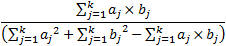 The Tanimoto coefficient between two points, a and b, with k dimensions is calculated as: