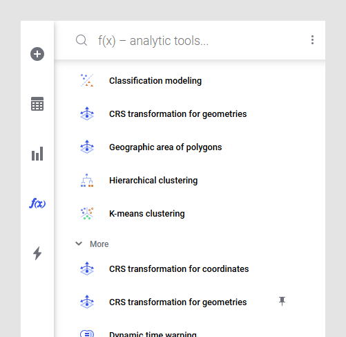 The f(x) flyout is used to provide easy access to commonly used tools and data functions. As an analysis author with the Pin data functions and the f(x) flyout license feature, you can pin or unpin your own selection of data functions from the library, built-in data functions, or tools (if you have access), to the flyout. An administrator can predefine selected data functions using a preference.