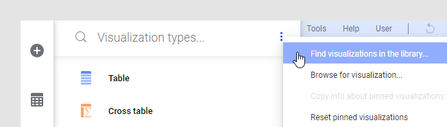 Visualization mods that have been saved to the library can be pinned, which means they are added next to the list of native visualizations in the Visualization types flyout. Once a visualization mod is part of the visualizations list, it becomes available for selection also in future analyses. In addition, the visualization mod will appear as a choice whenever you select a visualization type, for example, when you want to switch to another visualization or create a details visualization. - Saving a visualization mod to the library
