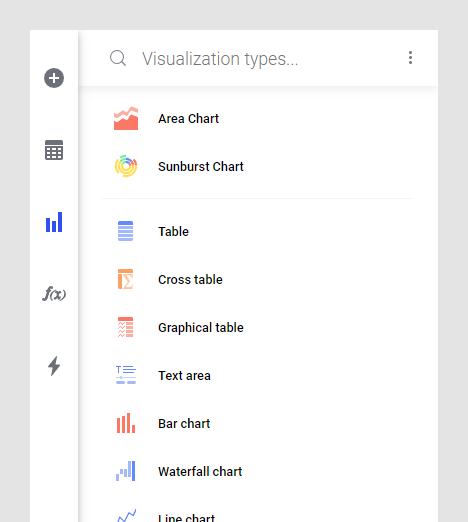 The Visualization types flyout gives you an overview of all the visualization types that are available to you. You can add a visualization to your analysis by clicking the visualization or using drag-and-drop.