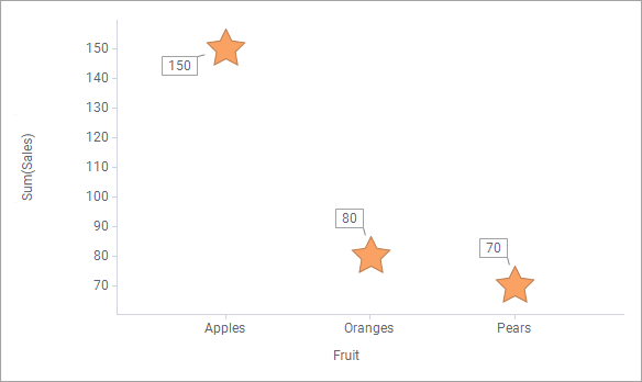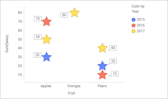 Take Pears, 2015, as example (the blue Pears star). The marker's new value shows the sum of pears sales for all three years (40+20+10). All markers within a fruit type get the same Y-axis value, no matter color (Year).