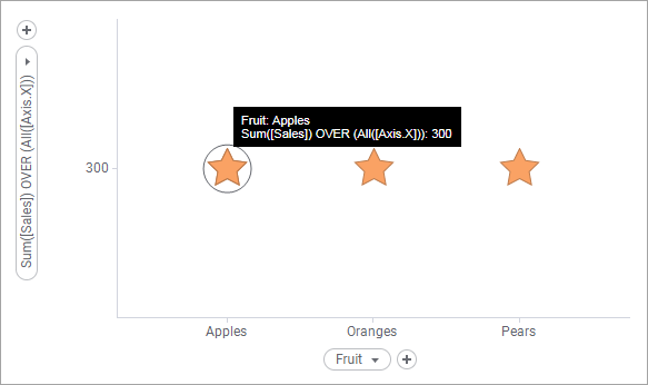 The scatter plot shows the sum of Sales for each Fruit; Apples, Oranges, and Pears. The total Sales amount is 300.