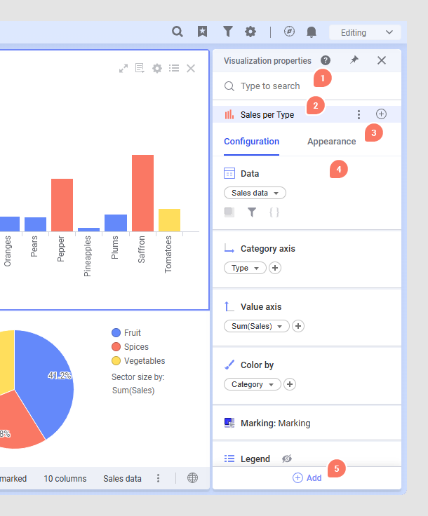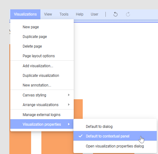 You can work with most visualization properties from the contextual visualization properties panel. To open the panel, select .