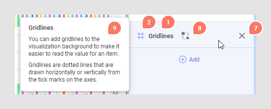 The property cards can differ in their behavior and how they can be used. Some cannot be removed and are always configured and present in the panel. If you removed one of these property cards you would break the visualization, for example the Data card or the axes cards (X-axis and Y-axis). Most cards can be expanded to show more settings. Some settings are already accessible in the collapsed state. Other cards are either "on" or "off" and are applied to the visualization immediately. Adding them to the panel acts like selecting a check box or turning on a switch.