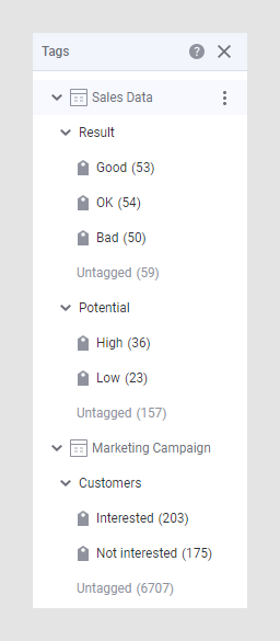 For example, you might want to assign a 'Top 10' tag to the highest ten values of a measure, or tag rows with 'Good', 'OK', or 'Bad'. Rows with the same tag, and also the rows that are untagged, can then easily be identified in a visualization.