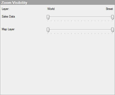 On the left, all layers are listed that are currently included in the map chart. Use the slider for each layer to set the zoom range within which the layer should be visible. The sliders correspond to the same zoom levels as the zoom slider in the map.
