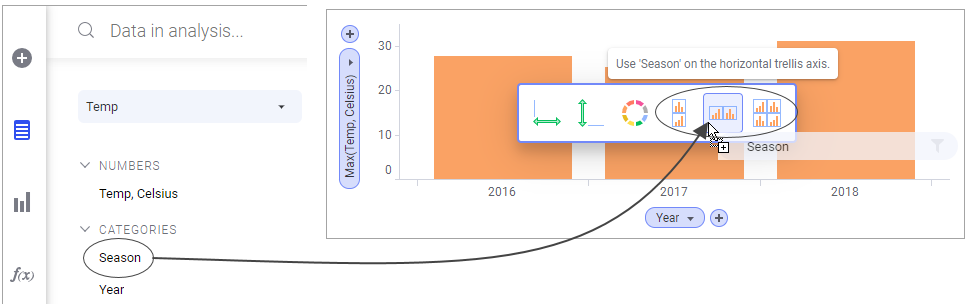 Assume you want to compare the highest temperature per season category across the years. By trellising the visualization by season you can view the seasonal temperatures in different panels.