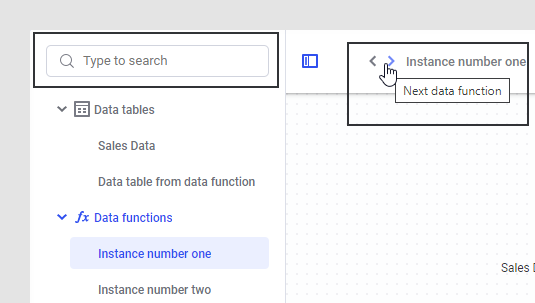 Use the search field in the data canvas sidebar and click on the data function instance name, or use the arrows next to the data function name, to navigate to a specific data function instance.