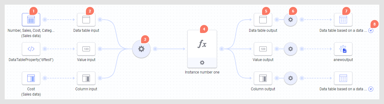 In the graphical structure, all inputs to the data function are listed to the left and all outputs to the right of the data function node ("fx" in this image). Note that the author of the data function can specify different icons for data functions when registering them, so you might see some other icon on your own data function node.