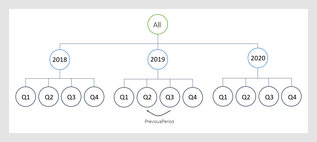 Einige Knotennavigationsmethoden eignen sich besonders für Hierarchien mit periodischen Daten, vor allem Zeithierarchien. Die Zeit ist von Natur aus hierarchisch strukturiert (wie Jahr, Quartal, Monat) und die Zeiträume sind wiederkehrend. Da die Knoten in einer Zeithierarchie offensichtlich sind, können alle Knoten, denen Daten fehlen, automatisch erkannt werden. Eine dieser Navigationsmethoden ist PreviousPeriod(), die auf den vorherigen Knoten innerhalb derselben Hierarchieebene verweist. Wenn Sie diese Methode in einem Ausdruck verwenden und Knoten fehlen, gibt der Ausdruck leere Werte für solche Knoten zurück.