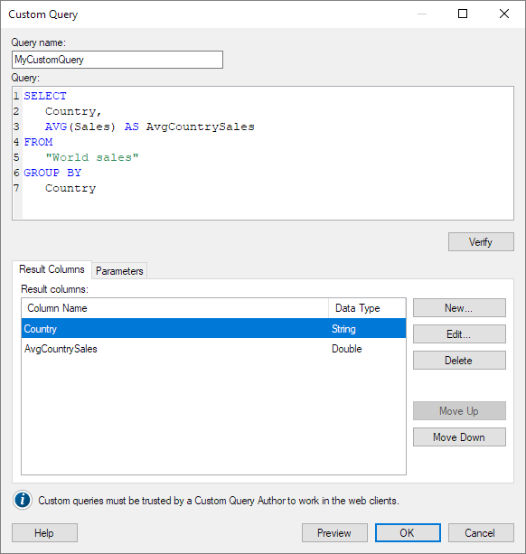 SELECT [SpotfireCustomQuery1].[Country] AS [Country], [SpotfireCustomQuery1].[AvgCountrySales] AS [AvgCountrySales] FROM (SELECT Country,AVG(Sales) AS AvgCountrySales FROM "World Sales" GROUP BY Country) AS [SpotfireCustomQuery1]