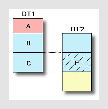 To help show the difference between the three options available, here is an example with two related data tables, DT1 and DT2. Both DT1 and DT2 contain some values that are not available in the other data table (pink and yellow), but they also contain common values (blue):