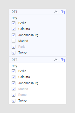With this option, Madrid is greyed out in DT2, because it has actively been filtered out in DT1, but Paris and Rome remain in DT1 and DT2 respectively, because those values have not been filtered out from any of the data tables.