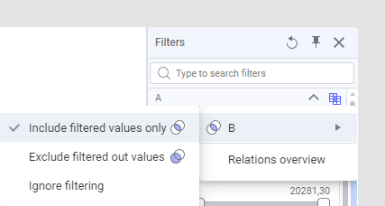 When you have multiple data tables that are related to each other in your analysis, and the data tables do not include exactly the same values, you might want to handle filtering in the related data tables in different ways, depending on whether you are interested in the filtered values or the filtered out values in the columns that define the relation.