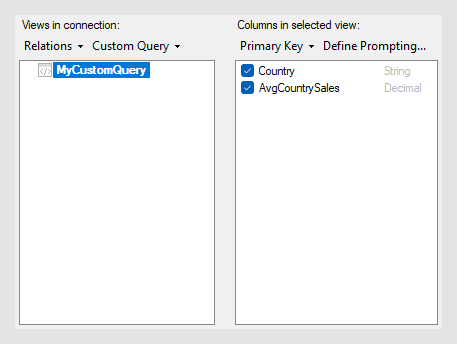 FROM de la consulta final que Spotfire envía el origen de datos externo. Por ejemplo, a continuación se muestra una consulta personalizada para una conexión de Microsoft SQL Server:SELECT Country,AVG(Sales) AS AvgCountrySales FROM "World Sales" GROUP BY Country