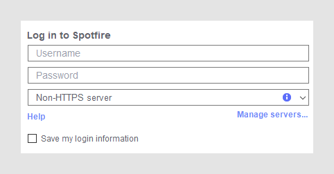 Para asegurarse de que la comunicación se cifra cuando se conecta a Spotfire Server, debe conectarse al servidor a través de HTTPS. Si se conecta a un servidor sin usar HTTPS, la información confidencial, como su nombre de usuario y contraseña, no está cifrada.
