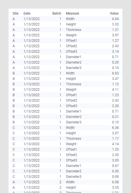 En este ejemplo tenemos un conjunto de datos más grande, con datos de una empresa imaginaria que produce pequeñas piezas de maquinaria. Estas piezas cuentan con medidas de anchura, altura y grosor. Las piezas tienen tres orificios distintos. También hay medidas del diámetro de estos orificios, así como una medida de un posible desplazamiento leve respecto al lugar donde deberían estar.
