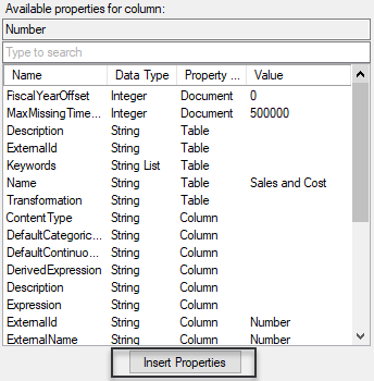 Tenga en cuenta que el nombre de la propiedad debe escribirse siempre entre comillas cuando se apliquen las funciones de propiedad. Si desea que una propiedad se interprete como un valor cuando se utiliza el cliente instalado, debe hacer clic con el botón secundario en la propiedad en el campo Propiedades disponibles para la columna y seleccionar Insertar como valor en el menú emergente.