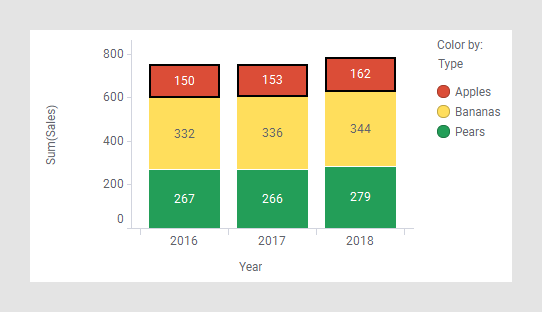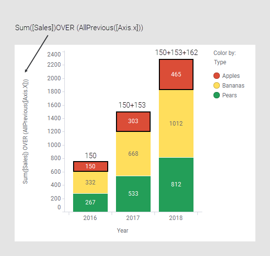 L'expression est appliquée sur chacune des parties des données. Par exemple, en 2017, les ventes de pommes sont au total de 303 depuis 2016, et en 2018, elles sont de 465.