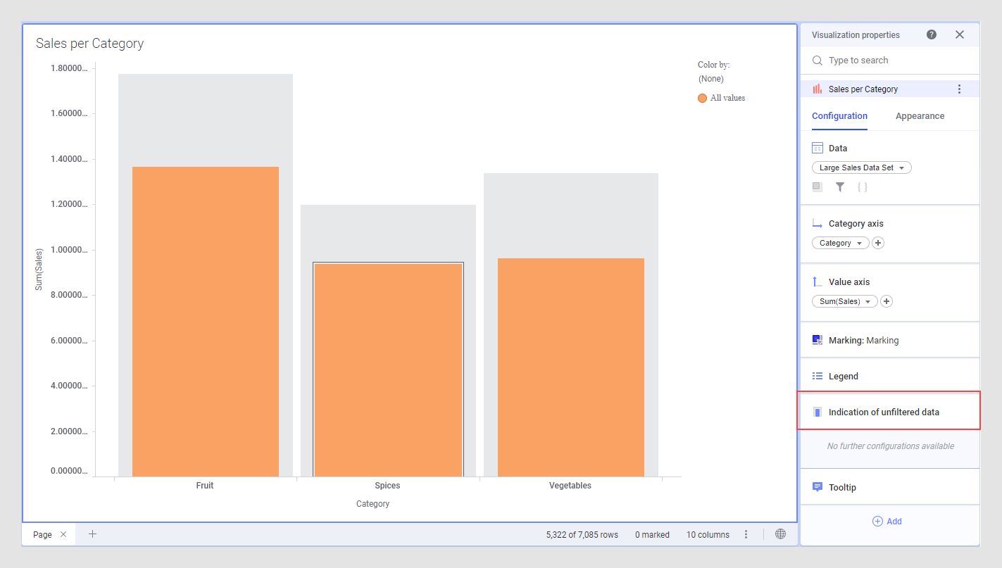 Lors de l’application d’un filtre dans un histogramme, la propriété Indication de données non filtrées (parfois aussi appelée Afficher des ombres pour indiquer les données non filtrées) vous permet d’afficher une ombre grise derrière toutes les barres visibles, indiquant la hauteur de la barre comme si tous les filtres étaient réinitialisés et que toutes les données étaient disponibles.
