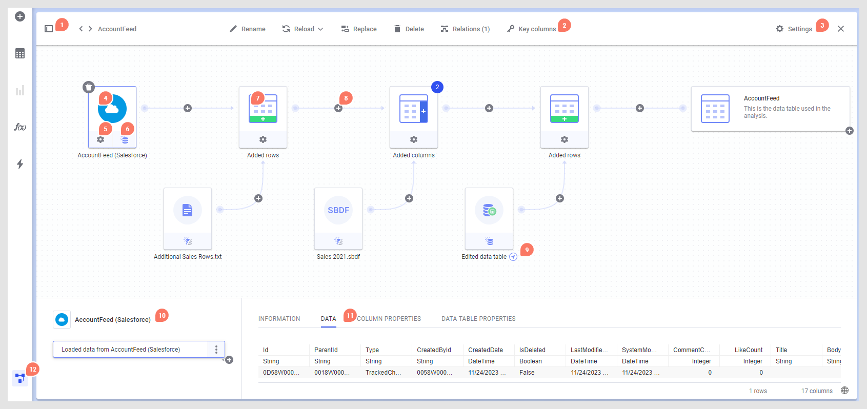 Quando si lavora con dei dati provenienti da un'origine dati collegabile (ad esempio i dati da Salesforce o i file di dati salvati nella libreria), è possibile decidere di salvarli all'interno dell'analisi o ricaricarli dall'origine ogni volta che l'analisi viene aperta. - Aggiunta di colonne combinate