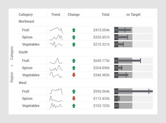 Nella tabella grafica sottostante, gli elementi dinamici mostrano l'andamento delle vendite per diverse categorie all'interno di ciascuna regione.