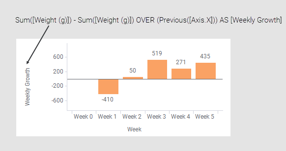 L'espressione calcola le differenze settimana per settimana. Il valore di ogni barra viene pertanto calcolato sottraendo il valore della barra precedente. La prima barra a sinistra viene saltata, perché non è presente alcun valore precedente a cui fare riferimento.