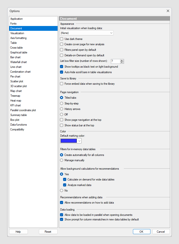 文書 ページでは、新しい分析 (文書) を作成するためのデフォルト設定を管理します。これらの設定は一般に、Spotfire で新しいデータを開いたり、新規文書を作成したりしたときに有効になります。