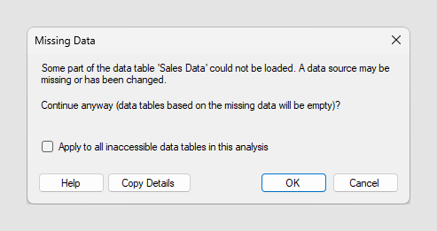 | この分析のアクセスできないすべてのデータテーブルに適用 | 分析を開いて、見つからないすべてのデータ ソースに空のデータテーブルを取得する場合は、このチェック ボックスをオンにします。 |