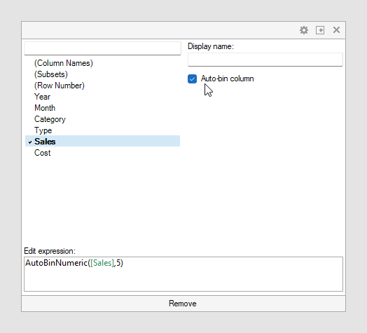 当合并函数(例如 BinByEvenIntervals 或 BinByEvenDistribution)作为自定义表达式应用时,合并操作中的结果将取决于轴表达式是对所有数据还是当前筛选的数据进行评估。如果使用了所有数据,您将获得一个类似于以上计算的合并列的结果,包含特定合并集。但是,如果将当前筛选考虑在内,则合并将使用筛选重新计算并将自动更新合并限制。