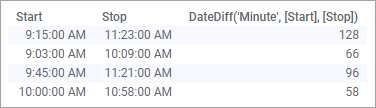 输入到“添加计算列”对话框中,可以计算开始时间和停止时间之间的时间差(以分钟表示)。