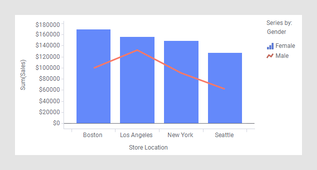 以下组合图说明了显示女士购买额总和与男士购买金额总和之间的差所需进行的设置。