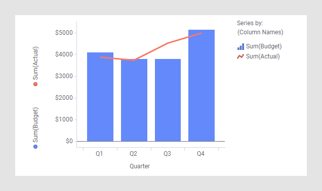 请参见将实际预算数字与估计预算数字相比较所需进行的设置。可以容易地确定偏差,例如第 3 季度大幅超过预算。