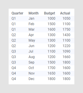 假设您要按季度将预算中的估计数字与实际数字进行比较。下面的“实际”列和“预算”列分别包含每月的实际数字和估计数字。