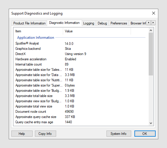 | 应用程序信息 | 列出您计算机中安装的 Spotfire 和 DirectX 的版本以及有关是否启用了硬件加速的信息。 |