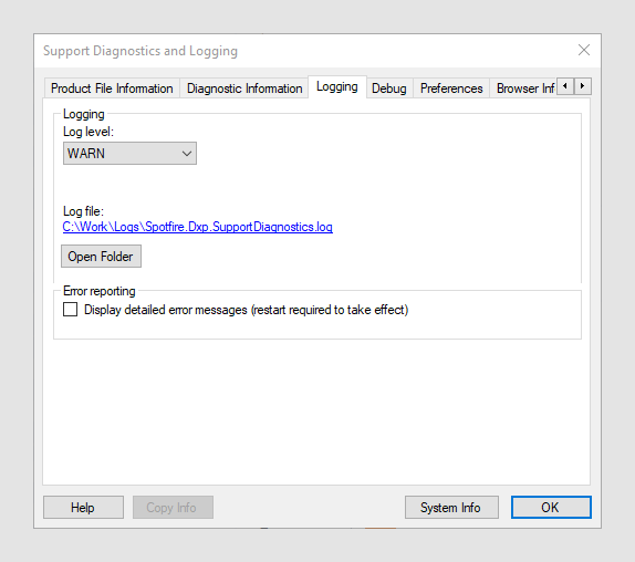 注: 支持诊断和日志记录仅在已安装的客户端中可用。Spotfire Server 管理员在使用 Web 客户端时有权访问 Web Player 服务的日志记录。