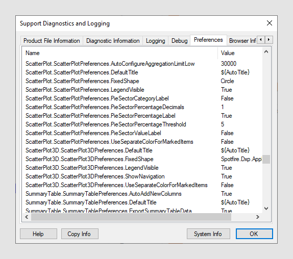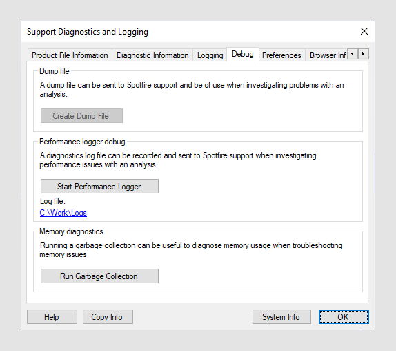 您也可以在支持人员要求时创建性能记录程序日志文件。此选项仅在分析打开时可用,因为它用于记录在特定分析中执行操作时发生的情况。单击“启动性能记录程序”,返回至分析,然后执行导致问题的操作,接着返回此对话框并单击“停止性能记录程序”。找到创建的日志文件,并将其加入与 Spotfire 支持人员的沟通内容中。