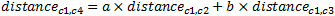 群集 C1 和新群集 C4 之间的距离计算方法为: