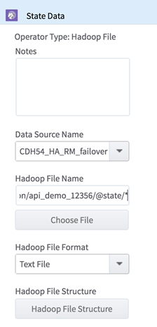 We navigate to the folder on our cluster where we stored the result file, and drag it to the canvas. We call it "State Data". Double-click the icon to bring up the configuration properties.