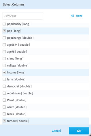 Our Summary Statistics configuration is shown below, showing statistics for the pop, income, and turnout columns.