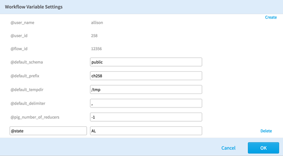 Below, you can see the initial workflow variable configuration, which includes the variable @state set to AL. Note that all workflow variables begin with @.