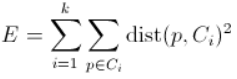 where k is the number of clusters, p is a member of cluster Ci, and dist is the distance of p from the center of Ci cluster.
