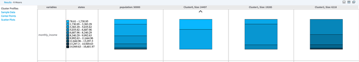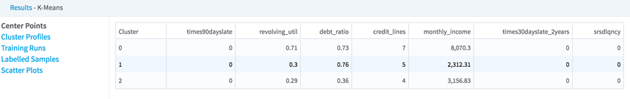 Note: The K-Means Center Point data can be used as a succinct and precise definition of the characteristics of the cluster. - Cluster Profiles - The Cluster Profiles results section provides an overall sense of how the data is partitioned into clusters.
